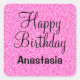 Um adesivo do quadrado Feliz de Aniversário com uma cintura rosa quente e brilho, e um escrevendo preto elegante. Você pode adicionar facilmente o nome de sua escolha e alterar a cor e a fonte do nome usando a opção personalizar!
