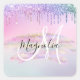 Um adesivo quadrado de goma-lama com gotas de brilho monocromático e monocromático do arco-íris, um derrame iridescente de tinta monocromática de arco-íris, e um fundo cor-de-rosa pincelado. Seu nome personalizado e monograma estão escritos em um roteiro elegante, escrito à mão. Você pode alterar a cor do texto, o estilo e o tamanho da fonte usando a opção personalizar.