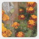 Estes adesivos apresentam ferrugem espantosa e flores laranja-marigadas crescendo por uma velha cerca rústica em Connecticut.