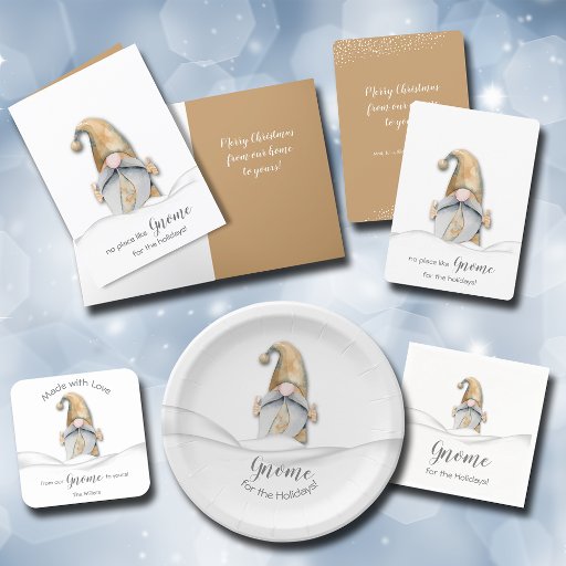 Gnomo bonitinho barbudo na neve com "do nosso Gnomo ao seu" ou sua mensagem de Natal de feriado em letras quentes em várias formas para seu assar de férias, itens caseiros e muito mais.