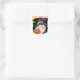 Este adesivo de Halloween mostra um gnomo branco bonito vestindo um chapéu roxo e verde. Ao lado dele está um sorriso Jack o' Lantern. Uma lua crescente amarela está no fundo. O texto laranja no topo diz Feliz Dia das Bruxas. Tudo é colocado sobre um fundo de areia negra e aflita. Fofo para selar bolsas de crianças!