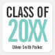 Adesivos de graduação modernos e ousados nas cores preto e azul turquesa.