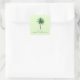 This wedding sticker features a serene tropical design with a single, centered palm tree on a soft pastel green background. The elegant serif typography below the tree reads "thank you," expressing gratitude in an understated manner. The color palette of lush greens and warm browns creates a calming and inviting atmosphere, perfect for conveying appreciation at your special event. The minimalist composition emphasizes simplicity and tranquility, making it ideal for those who appreciate clean and uncluttered aesthetics.