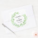 Um adesivo de casamento contemporâneo com uma coroa de louros aberta em delicadas tons verdes de aquarela. Edite o texto de amostra conforme desejar.