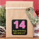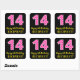 Este design de adesivo quadrado com tema de aniversário alegre apresenta um grande número "14", com um padrão cor-de-rosa escuro e listras de rosa claro. Ele também apresenta a mensagem "Feliz 14 Aniversário", e um nome personalizável. O fundo é preto colorido. Tímulos divertidos, alegres e personalizados como este podem ser dados como um presente de aniversário, ou usados enquanto embrulham presentes, ou talvez usados como decorações de festas de aniversário quando celebram o décimo quarto aniversário de alguém. [~Z0000578]