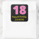 Este design de adesivo quadrado com tema de aniversário alegre apresenta um grande número "18", com uma rosa claro e um padrão de listras cor-de-rosa escuros. Também apresenta a mensagem "Feliz 18º aniversário", e um nome personalizado. O fundo é preto colorido. Tímulos divertidos e personalizados como este podem ser dados como presente de aniversário, ou usados enquanto embrulham presentes, ou talvez usados como decorações de festas de aniversário quando se celebra o décimo oitavo aniversário de alguém. [~Z0000578]