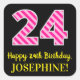 Este design de adesivo quadrado com tema de aniversário alegre apresenta um grande número de "24", com um padrão cor-de-rosa escuro e listras de rosa claro. Também apresenta a mensagem "Feliz 24.º Aniversário", e um nome personalizado. O fundo é preto colorido. Tímulos divertidos e personalizados como este podem ser dados como presente de aniversário, ou usados enquanto embrulham presentes/presentes, ou talvez usados como decoração de festas de aniversário quando se celebra o 24º aniversário de alguém. [~Z0000578]