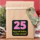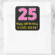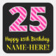 Este design de adesivo quadrado com tema de aniversário alegre apresenta um grande número de "25" com um padrão cor-de-rosa escuro e listras de rosa claro, juntamente com a mensagem "Feliz 25 de Aniversário", e um nome personalizado. O fundo é preto colorido. Adicionais alegres, divertidos e personalizados como este podem ser dados como um presente de aniversário, ou usados enquanto embrulham presentes, ou talvez usados como decoração de festas de aniversário quando celebram o aniversário de 25 de alguém. [~Z0000578]