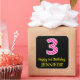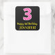 Este design de adesivo quadrado com tema de aniversário alegre apresenta um grande número "3", com um padrão cor-de-rosa escuro e listras de rosa claro. Também apresenta a mensagem "Happy aniversário de 3 anos," e um nome personalizado. O fundo é preto colorido. Bons, alegres, autocolantes personalizados como este podem ser dados como presente de aniversário, ou usados enquanto embrulham presentes, ou talvez usados como decorações de festas de aniversário quando celebram o terceiro aniversário de alguém. [~Z0000578]