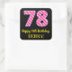 Esta animada design de adesivo quadrado com tema de aniversário apresenta um grande número "78" com uma rosa claro e um padrão de listras cor-de-rosa-escuro, juntamente com a mensagem "Feliz 78.º Aniversário", e um nome editável. O fundo é preto colorido. Bons, alegres, autocolantes personalizados como este podem ser dados como presente de aniversário, ou usados enquanto embrulham presentes/presentes, ou talvez usados como decoração de festas de aniversário quando celebram 78 anos de alguém. [~Z0000578]