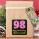 Este alegre design de adesivo quadrado com tema de aniversário apresenta um grande número de "98", com uma rosa claro e um padrão de listras cor-de-rosa-escuro. Também apresenta a mensagem "Feliz 98º aniversário", e um nome personalizável. O fundo é preto colorido. Bons, alegres, autocolantes personalizados como este podem ser dados como presente de aniversário, ou usados enquanto embrulham presentes, ou talvez usados como decorações de festas de aniversário quando celebram o 98º aniversário de alguém. [~Z0000578]