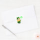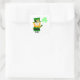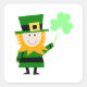 Um pequeno duende feliz está segurando um Shamrock irlandês.