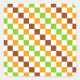 A vibrant checkered pattern of alternating green, orange, and brown squares on a white background. The design creates a lively, geometric feel.