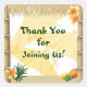 Um design gráfico do Tropical Luau Hawaiian Party Tiki Hut pelo artista/designer Charmaine Paulson em um adesivo de favor. O adesivo tem o texto (personalizável) Obrigado por se juntar a nós. ©2012