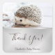 A parte superior mostra uma foto de um ouriço bebê fofo. A parte inferior apresenta um campo de texto prateado com um obrigado personalizado que você escreve para um chá de fraldas neutro em termos de gênero.