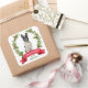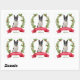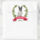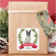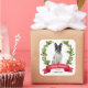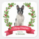 Nestes autocolantes de correspondência Feriados, um retrato de um Bulldog Francês preto e branco é cercado por uma coroa de morango vermelho. Na parte inferior está uma faixa vermelha com sua saudação de Natal personalizada, e sua assinatura está em verde embaixo dela.