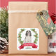 Nestes autocolantes de correspondência de Férias, um retrato de um coqueiro preto e branco está cercado por uma coroa de morango vermelho. Na parte inferior está uma faixa vermelha com sua saudação de Natal personalizada, e sua assinatura está em verde embaixo dela.