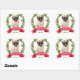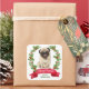 Nestes adesivos de correspondência de Feriado, um retrato de um adorável cão Pug está rodeado por uma coroa de morango vermelha. Na parte inferior está uma faixa vermelha com sua saudação de Natal personalizada, e sua assinatura está em verde embaixo dela.