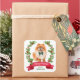Nestes autocolantes de correspondência de Férias, um retrato de um adorável cão Pomerano vermelho e branco está rodeado por uma coroa de morango vermelho. Na parte inferior está uma faixa vermelha com sua saudação de Natal personalizada, e sua assinatura está em verde embaixo dela.