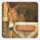 Design digital de uma mula no seu estábulo que tem uma placa de nome gravada à mão.