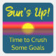 Desta vez, esmagar algumas metas | O Sunrise Square Sticker é um autocolante inspirador para um planejador ou um chamador. Ele apresenta o trabalho de arte do nascer do sol com a frase "Sun's Up, Time to Crush Some Metas" em amarelo brilhante. Mantenha isto para se encorajar.