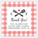 O toque perfeito para uma festa de noivado I Do Do CHURRASCO ou um favor de janto de ensaio, este adesivo tem o monograma do casal entre ferramentas de grelhamento em um padrão alegre de cobertor de piquenique vermelho.