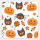 Um padrão super fofo de halloween. Nesta ilustração você pode ver abóboras, aranhas, corujas, estrelas e doces. O esquema de cores deste design de halloween é laranja, preto e branco.