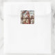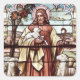 Um vidro colorido vintage em várias cores. Jesus fica com seu funcionarios segurando um carneiro enquanto duas outras ovelhas olham para ele