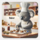 Um urso koala ocupado em sua cozinha cozinhando biscoitos e cupcakes em seu chapéu alto de padeiro. Veja seus amigos animais empalhados nos balcões e armários. Um design contemporâneo divertido. A palavra 'baker' pode ser alterada como desejado.