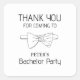 Adesivos de agradecimento personalizados para despedida de solteiro em preto e branco. Design simples e moderno personalizado com um nome e apresentando uma ilustração minimalista de gravata borboleta com o texto "obrigado por comparecer".