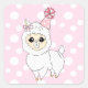 Um desenho animado bonito, desenhado à mão, lama, com um ódio de aniversário, com um fundo de bolinhas rosa e branco. Cute para selar convites de festas de aniversários ou doces favorece bolsas.