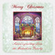 Design de vidro brilhante e vibrante colorido de lareira aconchegante multicolorido, com decorações ocas e natalinas, com grandes janelas de ornamentado, numa armação vermelha. Com um fundo verde claro e brilhante e "Feliz Natal". Você pode mudar a saudação pessoal personalizável na parte inferior do design para sua própria mensagem.