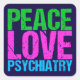 Psiquiatria de Paz e Amor em letras néon brilhantes e ousadas de verde, rosa e azul. Eu adoro o campo da psicologia e da medicina combinando-me com a minha especialidade, a psiquiatria. Personalize com a informação do seu psiquiatra como presente.
