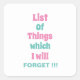 Engraçado Lembrete para Pessoas Esquecidas Não Esqueça o Pau Quadrado com uma citação engraçada - Lista de coisas que eu esquecerei!!! Atenção, pessoal esquisito! Hora de um lembrete pegajoso para nunca esquecer o herói descantado da rotulagem e organização: o adesivo quadrado! Então, da próxima vez que tentares controlar as coisas ou adicionar um toque aos teus pertences, não te esqueças dos teus autocolantes! Eles são o segredo para os esquecidos e os criativamente inclinados. Coloque-o, rotule-o e conquiste o mundo, um quadrado de cada vez!