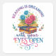 Design vibrante e colorido com um dragão com pilha de livros, o de cima aberto com rosas azuis e cor-de-rosa. O texto colorido diz: "Ler sonha com seus olhos abertos". Esse design está disponível em uma grande variedade de produtos.