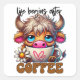 A playful and vibrant design showcases an adorable highland cow sipping coffee from a mug adorned with two hearts. A cheerful daisy adds charm to the scene, accompanied by colorful text that reads, "Life begins after coffee." This delightful design is featured on a variety of products, making it a perfect gift for coffee enthusiasts.
