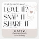 Um adesivo quadrado moderno "Ame-o e compartilhe-o" em branco e esticado com espaço para o seu nome comercial e links de mídia social. Este rótulo personalizado 'tag us' inclui ícones de mídia social para instagram, facebook, tiktok, pinterest e twitter, bem como espaço para adicionar sua hashtag personalizada. As fontes serif modernas com espirais acrescentam mais elegância a este adesivo de negócios "siga-nos". A maneira perfeita de encorajar os clientes a colocá-lo on-line e ajudá-lo a expandir sua pequena empresa.