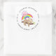 Devolva adesivos de endereço com uma ilustração com uma preguiça castanha engraçada e feliz pairando em um galho de árvore. Um arco-íris colorido atrás dele junto com um sol rosa pairando sobre a cabeça. Bonita, adorável e moda.