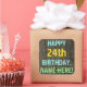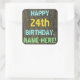 Este design de autocolante de aniversariante divertido apresenta uma mensagem como "FELIZ 24º ANIVERSÁRIO, NOME AQUI!", onde o nome pode ser personalizado. O fundo apresenta um padrão de aparência rústico, castanho e falso em grãos de madeira. O texto da mensagem personalizada apresenta cores como azul, amarelo e verde, e tem uma aparência inspirada pela das letras pintadas e estêncilhadas. Vinhetas como estas poderiam talvez ser dadas como presentes, ou talvez usadas como decorações numa festa de aniversário que está a ser realizada para alguém que está a celebrar o seu vigésimo quarto aniversário. [~Z0000296]