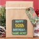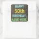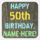 Este design de autocolante de aniversários divertido apresenta uma mensagem como "FELIZ 50º ANIVERSÁRIO, NOME AQUI!", onde o nome pode ser personalizado. O fundo apresenta um padrão de aparência rústico, castanho e falso em grãos de madeira. O texto da mensagem personalizada apresenta cores como azul, amarelo e verde, e tem uma aparência inspirada pela das letras pintadas e estêncilhadas. Vinhetas como estas poderiam talvez ser dadas como presentes, ou talvez usadas como decorações numa festa de aniversário para alguém que comemora o seu quinquagésimo aniversário. [~Z0000296]