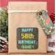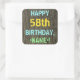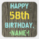 Este design de autocolante com tema de aniversário divertido apresenta uma mensagem como "HAPPY 58th BIRTHDAY,<NAME>!", onde o nome pode ser personalizado. O fundo apresenta um padrão de aparência rústico, castanho e falso em grãos de madeira. O texto de mensagem personalizável apresenta cores como azul, amarelo e verde, e tem uma aparência inspirada pela de letras pintadas e estêncilhadas. Vinhetas como estas poderiam talvez ser dadas como presentes, ou talvez usadas como decorações numa festa de aniversário que está a ser realizada para alguém que está a celebrar o seu cinquenta oitavo aniversário. [~Z0000296]