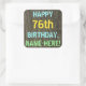 Este design de autocolante de aniversários divertido apresenta uma mensagem como "FELIZ 76º ANIVERSÁRIO, NOME AQUI!", onde o nome pode ser personalizado. O fundo apresenta um padrão de aparência rústico, castanho e falso em grãos de madeira. O texto de mensagem personalizável apresenta cores como azul, amarelo e verde, e tem uma aparência inspirada pela de letras pintadas e estêncilhadas. Os adesivos como estes poderiam talvez ser dados como presente, ou talvez usados como decorações numa festa de aniversário que está a ser realizada para alguém que comemora os seus setenta e seis anos. [~Z0000296]