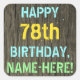 Este design de autocolante de aniversários divertido apresenta uma mensagem como "FELIZ 78º ANIVERSÁRIO, NOME AQUI!", onde o nome pode ser personalizado. O fundo apresenta um padrão de aparência rústico, castanho e falso em grãos de madeira. O texto de mensagem personalizável apresenta cores como azul, amarelo e verde, e tem uma aparência inspirada pela de letras pintadas e estêncilhadas. Os adesivos como estes poderiam talvez ser dados como um presente, ou talvez usados como decorações numa festa de aniversário que está a ser realizada para alguém que está a celebrar o seu setenta e oitavo aniversário. [~Z0000296]