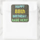 Este design de autocolante de aniversários divertido apresenta uma mensagem como "FELIZ 88º ANIVERSÁRIO, NOME AQUI!", onde o nome pode ser personalizado. O fundo apresenta um padrão de aparência rústico, castanho e falso em grãos de madeira. O texto de mensagem personalizável apresenta cores como azul, amarelo e verde, e tem uma aparência inspirada pela de letras pintadas e estêncilhadas. Os adesivos como estes poderiam talvez ser dados como um presente, ou talvez usados como decorações numa festa de aniversário para alguém que comemora o seu oitavo aniversário. [~Z0000296]