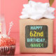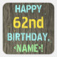 Este design de autocolante com tema de aniversário divertido apresenta uma mensagem como "HAPPY 62nd BIRTHDAY,<NAME>!", onde o nome pode ser personalizado. O fundo apresenta um padrão de aparência rústico, castanho e falso em grãos de madeira. O texto de mensagem personalizável apresenta cores como azul, amarelo e verde, e tem uma aparência inspirada pela de letras pintadas e estêncilhadas. Vinhetas como estas poderiam talvez ser dadas como presentes, ou talvez usadas como decorações numa festa de aniversário que está a ser realizada para alguém que está a celebrar o seu sexagésimo segundo aniversário. [~Z0000296]