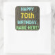 Este design de autocolante de aniversariante divertido apresenta uma mensagem como "FELIZ 70 BIRTHDAY, NAME-AQUI!", onde o nome pode ser personalizado. O fundo apresenta um padrão de aparência rústico, castanho e falso em grãos de madeira. O texto de mensagem personalizável apresenta cores como azul, amarelo e verde, e tem uma aparência inspirada pela de letras pintadas e estêncilhadas. Os adesivos como estes poderiam talvez ser dados como presente, ou talvez usados como decorações numa festa de aniversário para alguém que comemora seu setuagésimo aniversário. [~Z0000296]