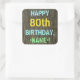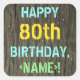 Este design de autocolante com tema de aniversário divertido apresenta uma mensagem como "FELIZ 80 BIRTHDAY,<NAME>!", onde o nome pode ser personalizado. O fundo apresenta um padrão de aparência rústico, castanho e falso em grãos de madeira. O texto da mensagem personalizada apresenta cores como azul, amarelo e verde, e tem uma aparência inspirada pela das letras pintadas e estêncilhadas. Os adesivos como estes poderiam talvez ser dados como presente, ou talvez usados como decorações numa festa de aniversário que está a ser realizada para alguém que comemora o seu oitavo aniversário. [~Z0000296]