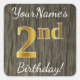 Este simples design de autocolante de aniversário apresenta uma mensagem como "segundo aniversário do seu nome!", com o "segundo" a ter uma aparência falsa/imitada de cor inspirada em ouro, num fundo falso de padrão de aparência de madeira. O nome pode ser personalizado. Os adesivos como estes poderiam talvez ser um presente para alguém que comemora o seu segundo aniversário, ou talvez pudessem ser usados como decorações numa festa de aniversário. [~Z0000251]