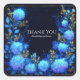 Make a truly magical and elegant impression with this stunning floral thank you sticker. The design features beautiful, illustrative clusters of luminous blue flowers, like hydrangeas, that seem to glow with an ethereal light against the dramatic, solid black background. These vibrant blooms are artfully arranged with delicate, metallic gold leaves and stems, adding a touch of sophisticated luxury. A magical spray of sparkling gold and blue glitter, like tiny fireflies, is scattered throughout the design. The entire composition is enclosed by a minimalist, thin gold square frame, completing the enchanted, celestial feel. These stickers are perfect for businesses that want to add a touch of magic, such as astrologers or spiritual guides to seal reading packets, boutique perfumers or candle makers for luxury packaging, high-end event planners for sealing gala invitations, or fantasy authors for book mail. This versatile design can also be used to beautifully seal envelopes for weddings, galas, or milestone birthdays, or as a sophisticated accent on party favors.