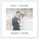 Estes adesivos de casamento simples e minimalistas apresentam sua foto pessoal favorita junto com seus nomes e as palavras "amor + obrigados" em texto de escrita negra.